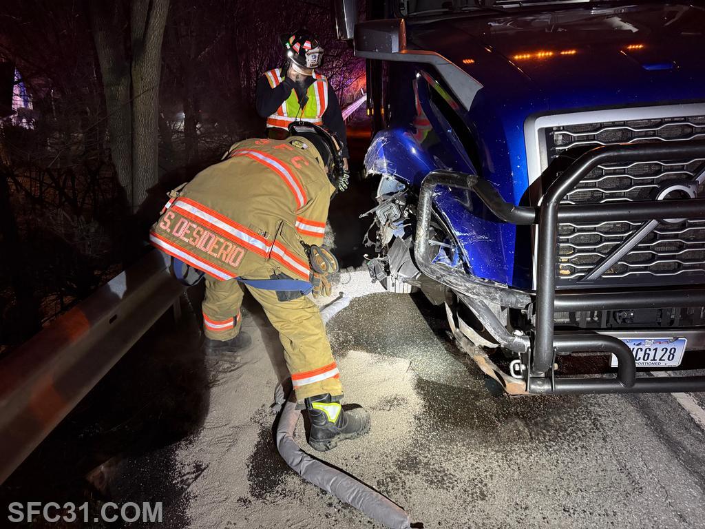 At 9:27 PM, units were re-dispatched to the scene for a fuel leak coming from the tractor‑trailer. Haz‑Mat personnel deployed socks, pads, and absorbent to contain the active leak and prevent further spread.